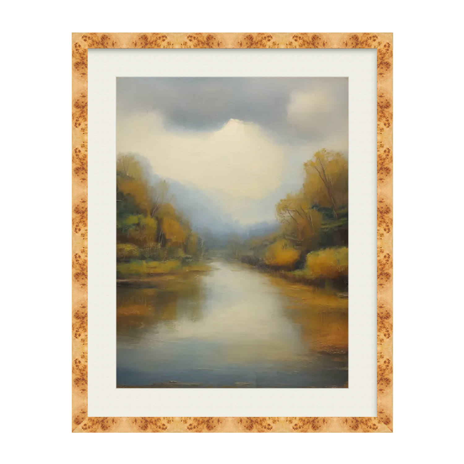 Delta blends rich ochres, soft blues, warm browns, and muted greens to create a landscape full of warmth, depth, and atmosphere. The gentle haze over the distant mountains gives it an almost nostalgic calm, while the golden trees add a cozy glow that immediately warms a room.
