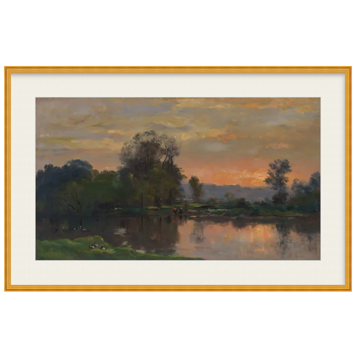 With its warm sunset sky, gentle reflections, and painterly silhouettes of trees, this artwork brings calm elegance and an understated glow into your home. It feels romantic, nostalgic, and effortlessly classic — the kind of landscape you'd expect to see in a thoughtfully styled living room, bedroom, or dining space.